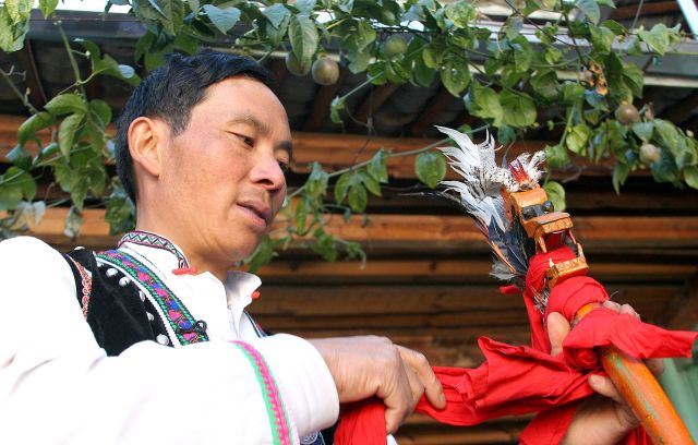 一位秧佬鼓表演者正在梳理“龍頭”,“龍頭”是秧佬鼓表演中的指揮棒,由上好木材制成,前面雕刻龍頭,后插山雞尾羽,象征龍鳳呈祥,寓意來年風(fēng)調(diào)雨順、國泰民安。
