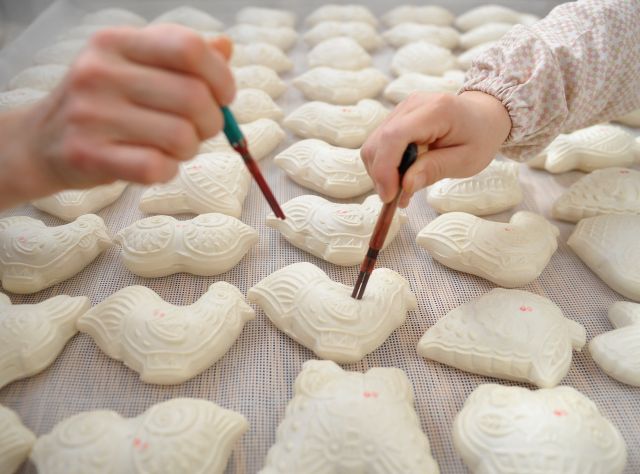 河北省黃驊市一家面花作坊的工人給剛剛出籠的面花點(diǎn)上寓意吉祥喜慶的紅點(diǎn)。