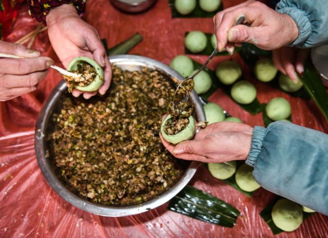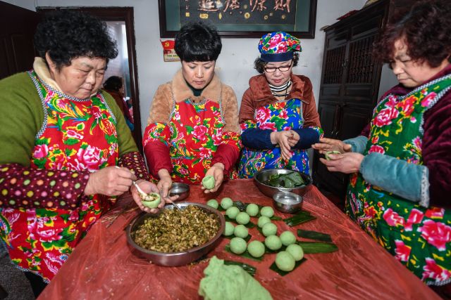 在浙江湖州,人們依據(jù)傳統(tǒng)習(xí)俗村民們忙著殺年豬、做肉圓、做青團(tuán)和魚圓等美食。青團(tuán)是江南地區(qū)一帶的傳統(tǒng)特色小吃,青色,用艾草的汁拌進(jìn)糯米粉里,再包裹進(jìn)豆沙餡兒或者蓮蓉,不甜不膩,帶有清淡卻悠長(zhǎng)的青草香氣。