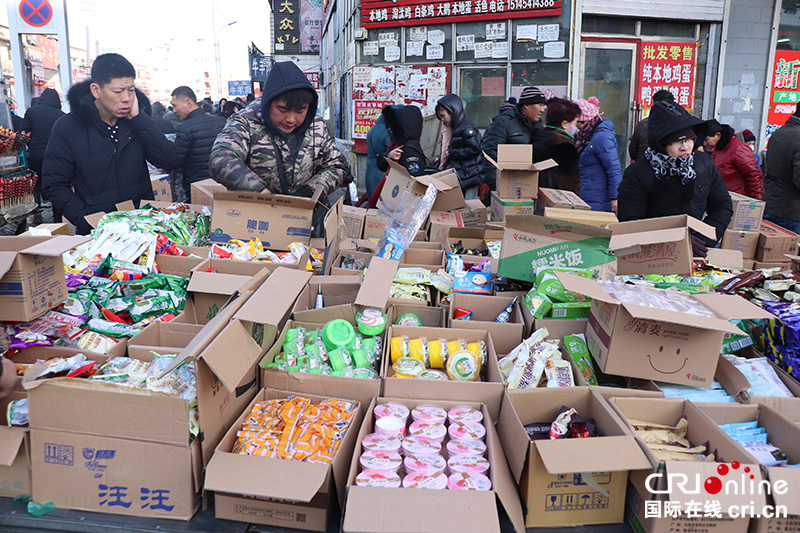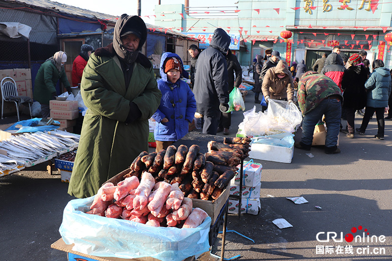2月3日,臘月二十九,黑龍江省齊齊哈爾市克山縣的綜合貿(mào)易大市場是當(dāng)?shù)夭少徧厣曦浀暮萌ヌ?。零?3度的露天市場里隨處可見捂得嚴(yán)嚴(yán)實(shí)實(shí)的買家和賣家。來這兒采購年貨的市民,都是奔著“凍貨”來的。