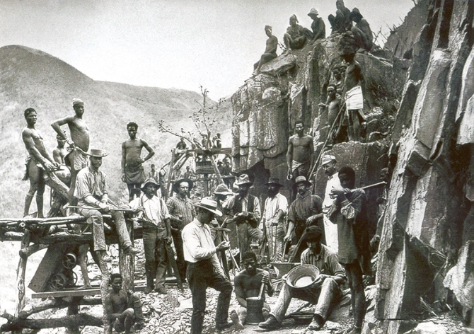 殖民掠奪是資本主義原始積累的重要途徑。早期殖民掠奪的方式,包括奴隸貿(mào)易、攫取金銀等。到了19世紀(jì)末,資本主義進(jìn)入了帝國(guó)主義階段,殖民掠奪形式由商品輸出為主變成了資本輸出為主,殖民地國(guó)家和地區(qū)依然遭受著殘酷掠奪。圖為1888年攝于南非的反映英國(guó)殖民者開(kāi)采金礦、掠奪黃金的照片。