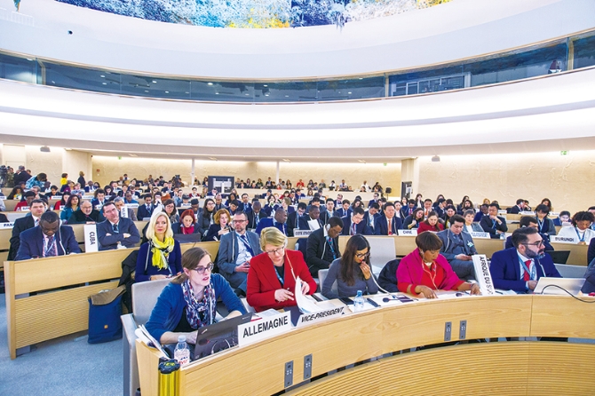2018年3月23日,在瑞士舉行聯(lián)合國(guó)人權(quán)理事會(huì)第37屆會(huì)議。會(huì)議通過(guò)中國(guó)提出的“在人權(quán)領(lǐng)域促進(jìn)合作共贏(yíng)”決議,第一次同時(shí)把推進(jìn)構(gòu)建人類(lèi)命運(yùn)共同體,推進(jìn)構(gòu)建相互尊重、公平正義、合作共贏(yíng)的新型國(guó)際關(guān)系寫(xiě)入聯(lián)合國(guó)的文件。這是繼2017年3月17日構(gòu)建人類(lèi)命運(yùn)共同體理念首次載入聯(lián)合國(guó)安理會(huì)決議后,中國(guó)理念回聲再起,體現(xiàn)了這一理念已經(jīng)得到廣大會(huì)員國(guó)的普遍認(rèn)同。圖為會(huì)議現(xiàn)場(chǎng)。 新華社記者 徐金泉/攝