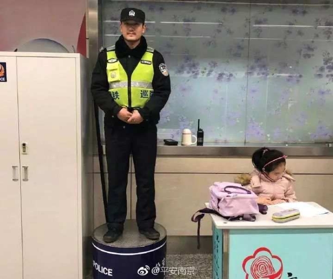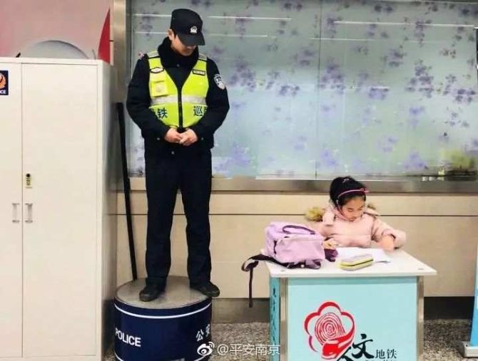 @平安南京:說好來接的媽媽還沒到,下了寒假培訓(xùn)班的小女孩征得地鐵警察叔叔同意后,在旁邊認(rèn)真地寫起了寒假作業(yè)。網(wǎng)友:厲害了,寫作業(yè)都有人守護(hù)