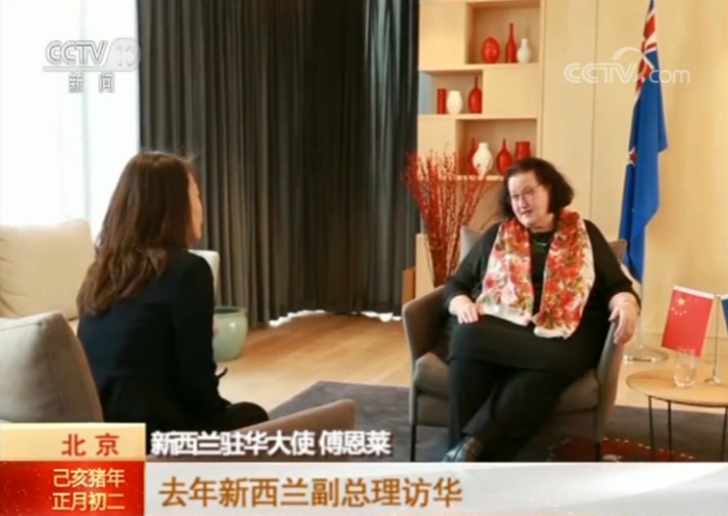 新西蘭駐華大使 傅恩萊:2018年也是新中兩國簽署自由貿易協(xié)定十周年,新西蘭是第一個與中國簽署自貿協(xié)定的經合組織成員國。我希望兩國多年建立的關系通過高層級互訪和交流等,2019年能穩(wěn)步繼續(xù)。旅游方面也是大年,因為2019年是新中旅游年,我們歡迎更多的中國學生來新西蘭留學,同時也鼓勵更多的新西蘭年輕人去中國讀書。相信接下去的一年對于新中兩國來說,將是豐富而積極的一年。