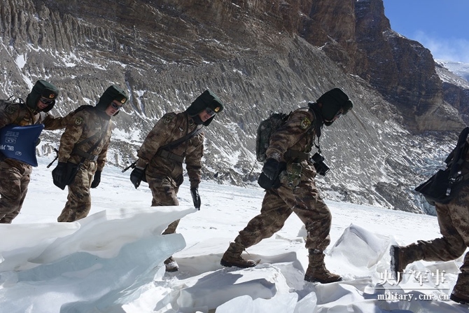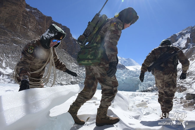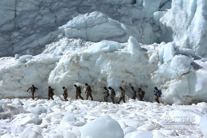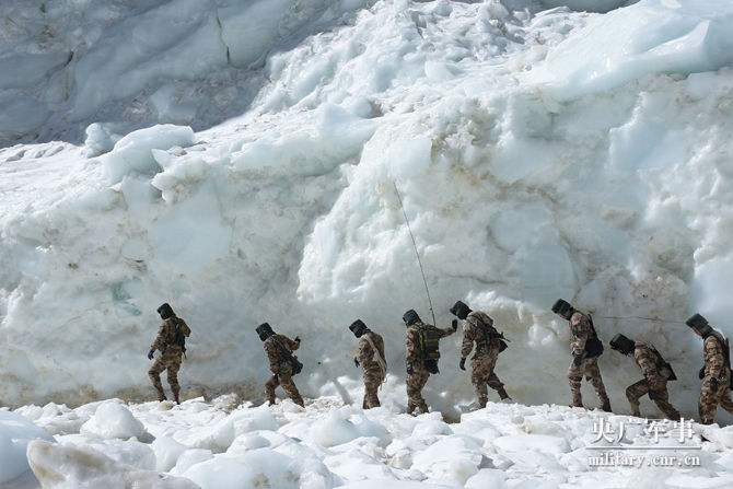 目標(biāo)就在眼前,是亙古冰川,刀插不進(jìn),鷹飛不過?! ▲B不敢來,哨兵常在。張宇對(duì)這個(gè)冰川再熟悉不過了,數(shù)度與之交手。只見他簡單勘察地形,迅速牽繩上前,招呼隊(duì)員跟上。筆者排在墊后的下士衛(wèi)生員崔元博前面,咬緊牙關(guān)跟上。