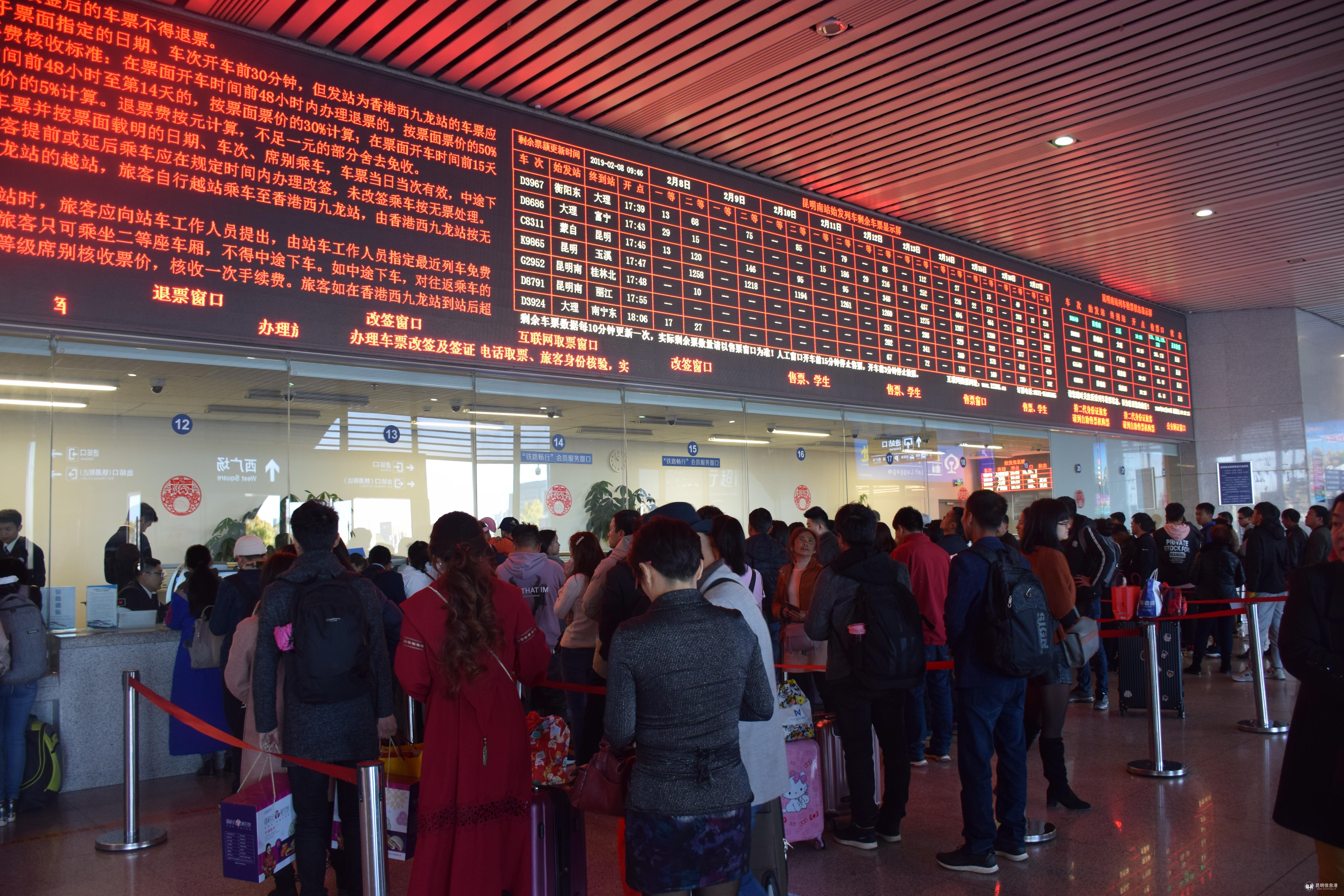 為滿足旅客節(jié)日期間購(gòu)票需求,避免長(zhǎng)時(shí)間排隊(duì),昆明站、昆明南站實(shí)行分區(qū)、分功能售票,根據(jù)客流情況開足人工售票窗口,便于旅客辦理學(xué)生、務(wù)工團(tuán)體、當(dāng)日及退改簽、掛失補(bǔ)等特殊業(yè)務(wù)。同時(shí),兩站加大互聯(lián)網(wǎng)售票的宣傳力度,組織客運(yùn)人員在售票廳和自助售票區(qū)積極宣傳互聯(lián)網(wǎng)和手機(jī)購(gòu)票的優(yōu)越性,主動(dòng)引導(dǎo)旅客掃描“昆鐵+”APP二維碼、下載12306手機(jī)app,指導(dǎo)旅客使用手機(jī)、互聯(lián)網(wǎng)購(gòu)票,減輕車站人工窗口售票壓力,提高售票效率。以此同時(shí),針對(duì)部分旅客進(jìn)站后未趕上列車,在昆明站大廳總服務(wù)臺(tái)、昆明南站旅客服務(wù)中心各設(shè)置了1個(gè)人工窗口,滿足進(jìn)入候車室的旅客退票、改簽需求。