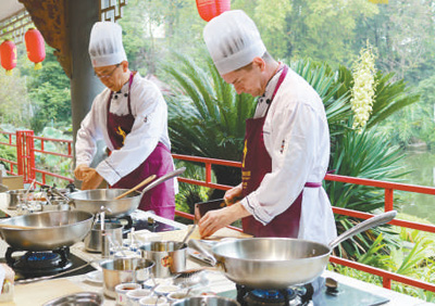 博物館副館長張輝強告訴記者,實作體驗廚藝教室是最受游客歡迎的。明亮的開放式大廚房,鍋碗瓢盆油鹽醬醋一應俱全,近五米長的灶臺就有15組,最多可同時容納100多人現(xiàn)場體驗?!拔覀冊谶@里教大家做得最多的,是麻婆豆腐和宮保雞丁這兩道經(jīng)典川菜。雖然用的是最常見的食材和最普通的調味品,做出來卻是非常美味,這就是川菜神奇的地方?!?/p>