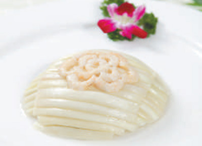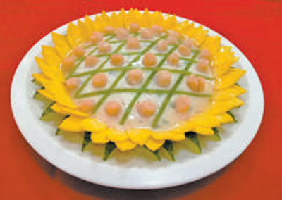 將什錦配料(水發(fā)海參、水發(fā)干貝、鮮蝦仁、金華火腿、蒸蛋黃糕、香菇、口蘑子、毛豆粒、裙邊、魚肚)切丁后,放入沸水中翻滾片刻后撈出;起鍋將香油燒熱后放入蔥姜末,然后下入什錦配料,加料酒和鹽翻炒熟后撈出。黃瓜切成三角狀,蒸蛋黃糕切成大、中兩個型號的雞心狀,蕓豆切成長條狀備用。將雞脯肉剁成泥,加入鹽、料酒、蛋清、三套湯(雞鴨肉等熬制)調制成雞肉茸。把備好的什錦配料放入盤中央,在上面蒙上一層調制好的雞肉茸,在盤最外圍擺放切好的黃瓜,蒸蛋黃糕片由外到內擺放兩圈,大號在外,中號在內。把蕓豆長條在中央擺成網(wǎng)狀,在每個網(wǎng)格中擺放一粒水發(fā)干貝。準備就緒后,在盤上覆蓋一層保鮮膜,放入蒸鍋蒸3分鐘左右取出。熬制流水芡,在盤中均勻地澆灑少許,以提亮色澤。