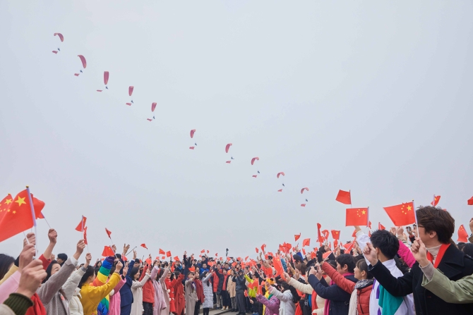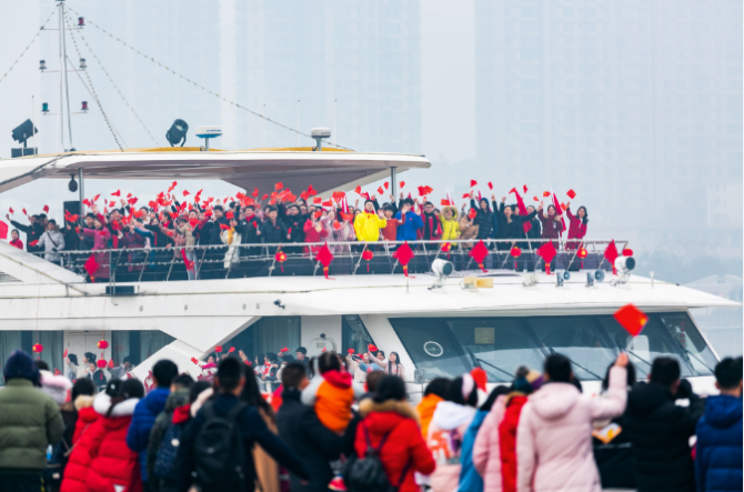 在歌曲高潮部分,十架動力傘從遠(yuǎn)空滑翔而來,掛上鮮艷的五星紅旗。同時,一艘載客近千人的大游輪開足馬力,駛向洲頭。此時,船上、岸上、天上——“海陸空”三處遙相呼應(yīng),引爆全場激情,萬人揮舞國旗,高聲同唱《我和我的祖國》,給祖國送上新春祝福。