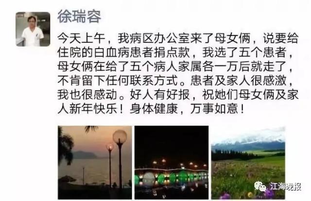 母女倆在病區(qū)僅僅停留了幾分鐘就匆匆離去,徐瑞容在她們離開后忍不住發(fā)了朋友圈,“只是對她們這份愛心致敬吧。”徐瑞容說。