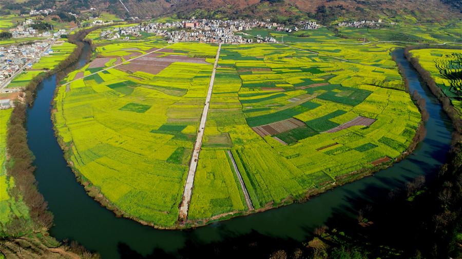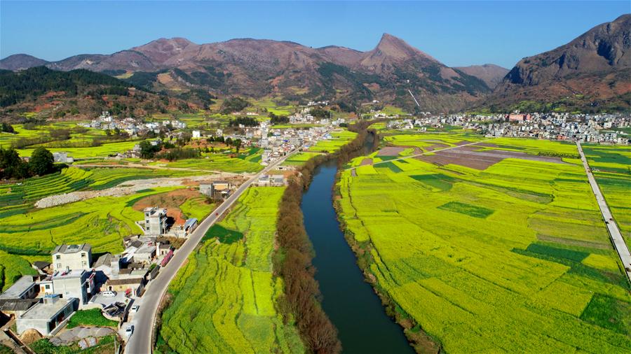 這是2月10日在云南省羅平縣拍攝的油菜花田(無人機(jī)拍攝)。 初春時節(jié),云南曲靖市羅平縣的油菜花盛開,黃花、碧水、群山、村舍相映成趣,透出濃濃春意。