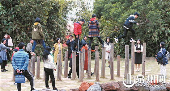 2月10日,泉州少林寺游人如織,一些小朋友正在體驗少林武僧的梅花樁。 (陳英杰/攝)