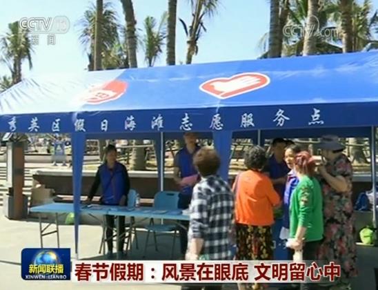 在海南,景區(qū)隨處可見文明旅游提示標(biāo)語,來自社會各界的志愿者引導(dǎo)游客,雖然前來旅游的游客爆滿,但是現(xiàn)場秩序井然。