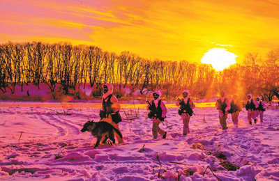北部戰(zhàn)區(qū)陸軍某邊防旅官兵在零下20攝氏度的嚴(yán)寒天氣巡邏執(zhí)勤。徐 輝攝(人民視覺)