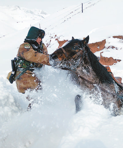 新疆克孜勒蘇軍分區(qū)玉其塔什巡邏小分隊(duì)官兵蹚著齊腰深的大雪巡邏。劉 慎攝(人民視覺)