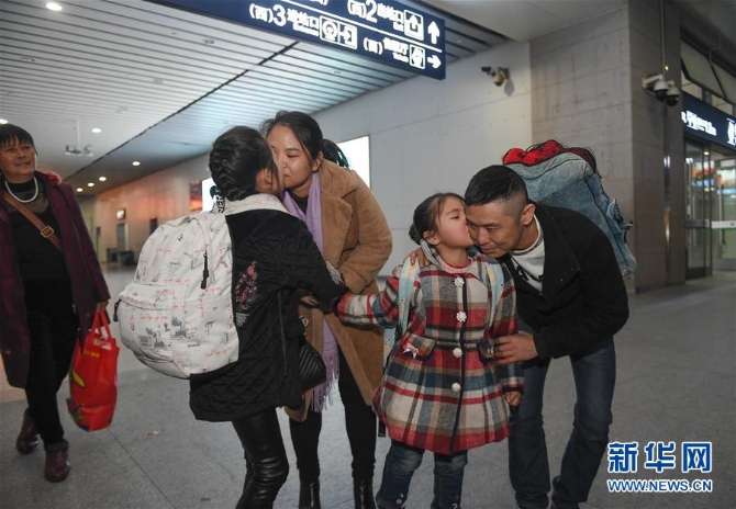 1月24日,在福州南站,黃詩韻(左二)、黃嘉韻(右二)姐妹倆親吻前來接站的父母。這是姐妹倆第一次坐高鐵從四川省隆昌市黃家鎮(zhèn)木匠沖村來到遙遠的福建與父母團圓過春節(jié)。新華社 記者宋為偉/攝