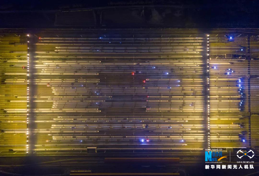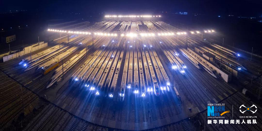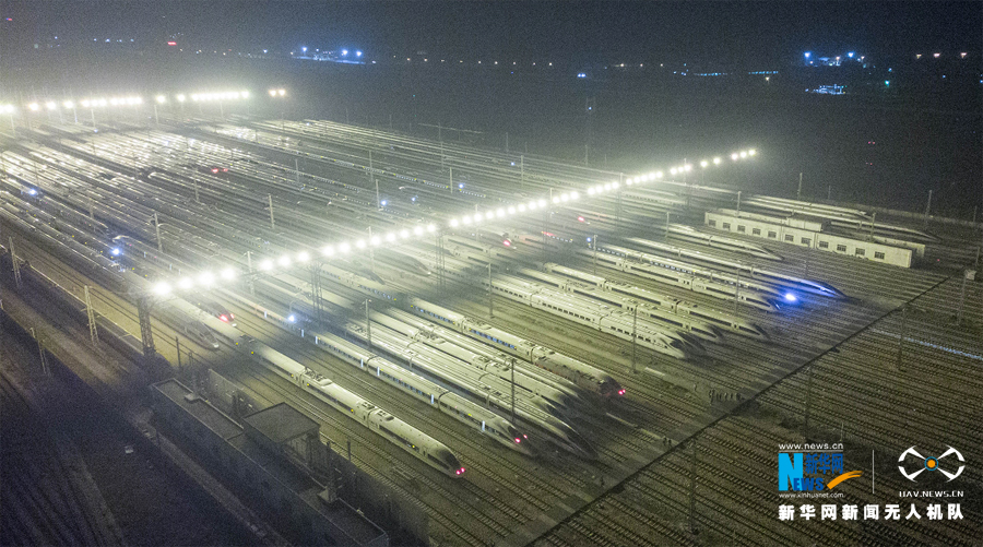 今年春運(yùn),每當(dāng)夜幕降臨,百組“復(fù)興號”動車組停靠在廣州動車段各運(yùn)用所上,整裝待發(fā),宛如“陸地艦隊(duì)”。新華網(wǎng)發(fā)(宋興華/攝)