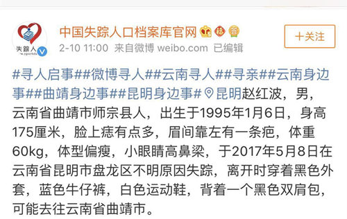 趙紅波,男,云南省曲靖市師宗縣人,出生于1995年1月6日,身高175厘米,臉上痣有點多,眉間靠左有一條疤,體重60kg,體型偏瘦,小眼睛高鼻梁,離開時穿著黑色外套,藍(lán)色牛仔褲,白色運動鞋,背著一個黑色雙肩包,可能去往云南省曲靖市。