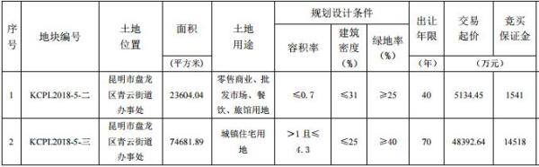其中,KCPL2018-5-二號地塊面積約35.4畝,容積率≤0.7,土地性質(zhì)為零售商業(yè)、批發(fā)市場、餐飲、旅館用地,交易起價5134.45 萬元,土地單價約145萬元/畝,樓面價約3107元/平米。KCPL2018-5-三號地塊面積約112畝,容積率>1≤4.3,為城鎮(zhèn)住宅用地,交易起價48392.64萬元。土地單價約432萬元/畝,樓面價約1507元/平米。