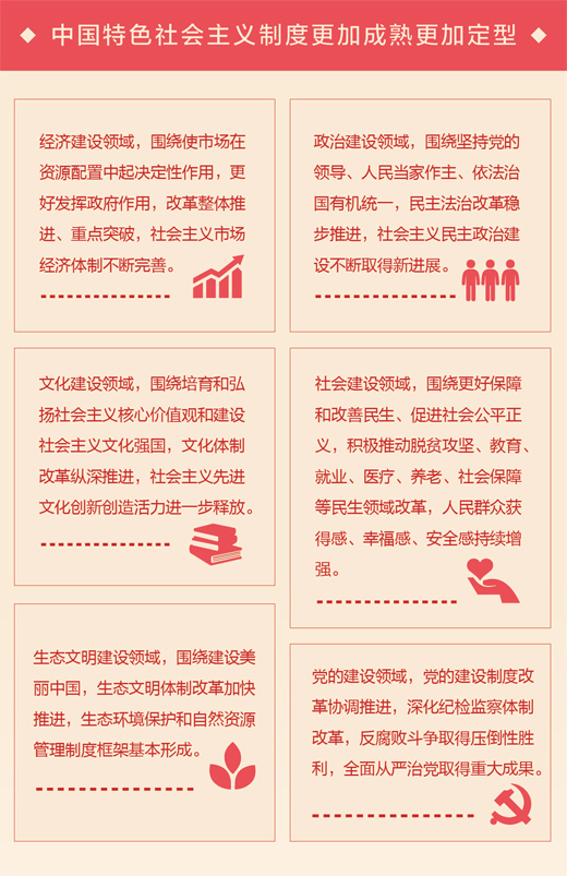 守正創(chuàng)新的生動體現(xiàn)。改革開放以來,我們堅持守正創(chuàng)新的基本邏輯、價值取向,既表現(xiàn)出志不改、道不變的堅定,也表現(xiàn)出大膽地試、勇敢地改的決斷;既注意到社會變革的深刻性、廣泛性、復(fù)雜性,又保持了社會發(fā)展的方向性、穩(wěn)定性、延續(xù)性。對于中國制度而言,就是堅持和完善根本政治制度、基本政治制度、基本經(jīng)濟(jì)制度,完善中國特色社會主義法律體系,不斷創(chuàng)新經(jīng)濟(jì)體制、政治體制、文化體制、社會體制、生態(tài)文明體制等各項具體制度。比如,從經(jīng)濟(jì)領(lǐng)域來看,我們既始終堅持公有制經(jīng)濟(jì)為主體,又不斷探索基本經(jīng)濟(jì)制度有效實現(xiàn)形式,筑牢了鞏固和發(fā)展中國制度的基礎(chǔ);我們既始終堅持發(fā)揮社會主義制度的優(yōu)越性,又注重突破舊的經(jīng)濟(jì)體制束縛,建立起社會主義市場經(jīng)濟(jì)體制,實現(xiàn)了社會主義基本制度與市場經(jīng)濟(jì)體制相結(jié)合的偉大創(chuàng)舉。黨的十八屆三中全會以來,以習(xí)近平同志為核心的黨中央圍繞全面深化改革總目標(biāo),著力抓好重大制度創(chuàng)新,全面深化經(jīng)濟(jì)、政治、文化、社會、生態(tài)文明體制和黨的建設(shè)制度改革。目前,黨的十八屆三中全會提出的336項重大改革舉措中已出臺實施方案的超過95%,中國制度守正創(chuàng)新結(jié)出累累碩果。