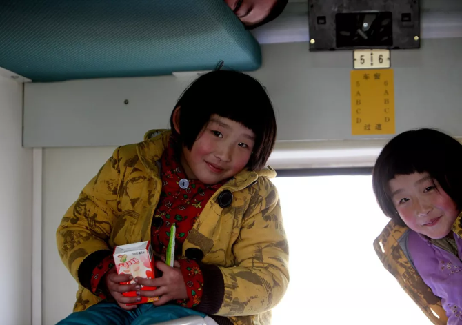?我拍到一對可愛的雙胞胎姐妹,背后是臥鋪改硬座的標(biāo)志。