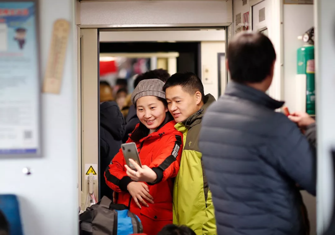 ?車廂里玩自拍的一對夫妻,臉上帶著回家的喜悅。