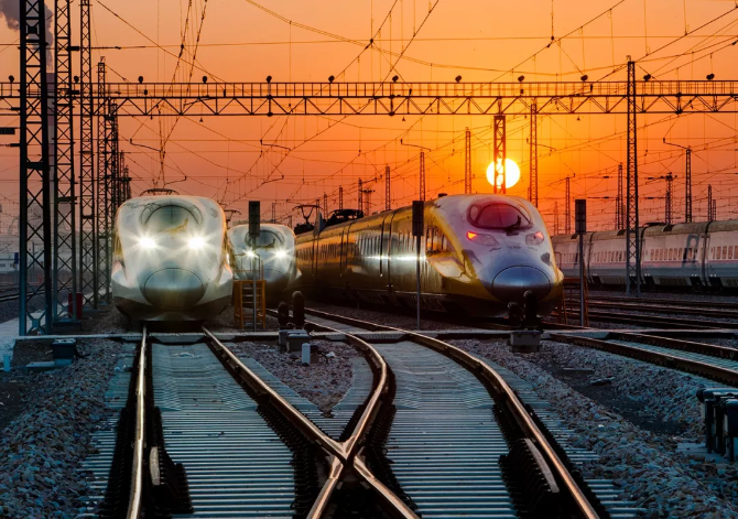 ?曙光中的高鐵列車。
