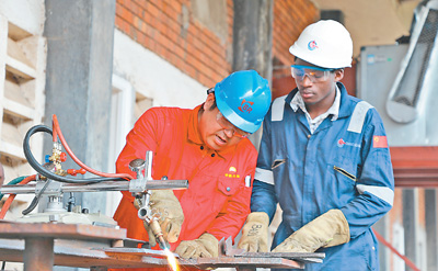 ?中國(guó)老師在烏干達(dá)培訓(xùn)當(dāng)?shù)匾患衣殬I(yè)技術(shù)學(xué)院的學(xué)生。記者呂強(qiáng)/攝