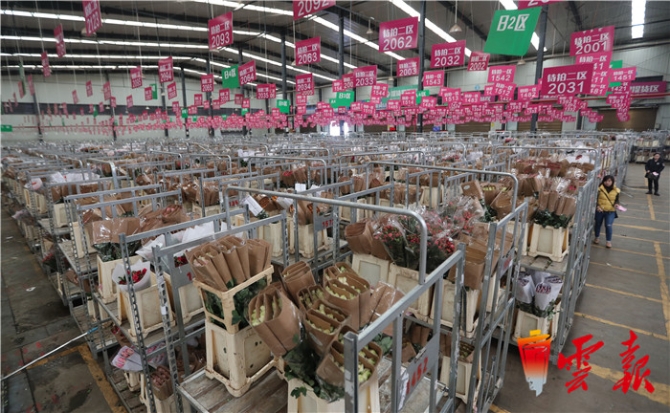 在昆明斗南花卉市場拍賣中心待拍區(qū),以玫瑰為主的大批鮮花入場拍賣。連日來,昆明斗南花卉市場拍賣中心,以玫瑰為主的鮮花交易異常紅火,交易峰值單日達(dá)1500萬枝。