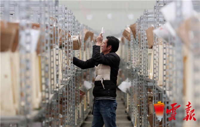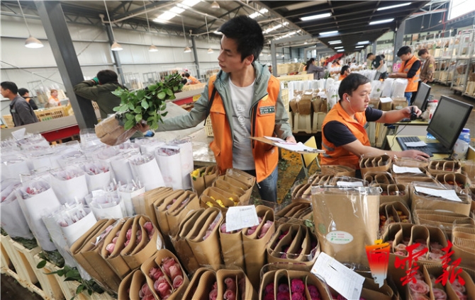 鮮花采購商在昆明斗南花卉市場拍賣中心待拍區(qū)查驗玫瑰花的質(zhì)量,以此確定競拍鮮花。從昆明斗南電子交易中心獲悉,迎接節(jié)后鮮花交易高峰,斗南花卉市場在春節(jié)期間就進(jìn)入了情人節(jié)鮮花備貨期,10日以后進(jìn)入供貨高峰期,當(dāng)日交易峰值達(dá)到1500萬枝;交易鮮花均價較節(jié)前上漲達(dá)70%以上,其中以紅色系玫瑰為主的鮮花交易量節(jié)節(jié)攀升,價格翻倍,成為最暢銷的鮮花品種。