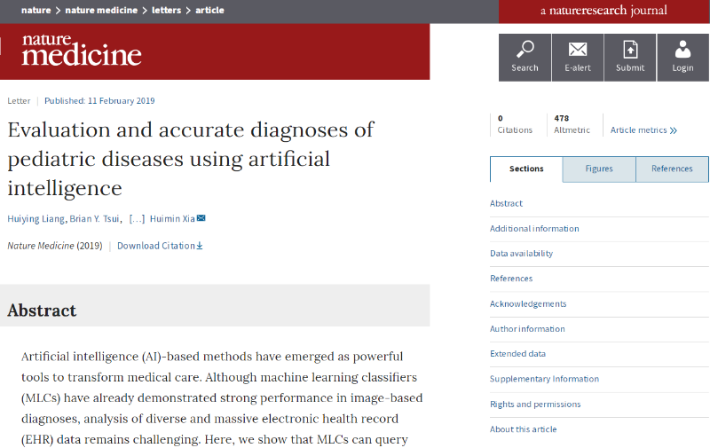 據(jù)美國石英雜志網(wǎng)站(QUARTZ)2月13日報道,國際知名醫(yī)學科研期刊《自然·醫(yī)學》(《Nature Medicine》)2月11日刊發(fā)了《使用人工智能評估和準確診斷兒科疾病》(Evaluation and accurate diagnoses of pediatric diseases using artificial intelligence)一文,這是中國在醫(yī)學診斷中應用人工智能的最新研究成果之一,也是全球首次在頂級醫(yī)學雜志發(fā)表有關(guān)自然語言處理(NLP)技術(shù)基于中文文本型電子病歷(EMR)做臨床智能診斷的研究成果。