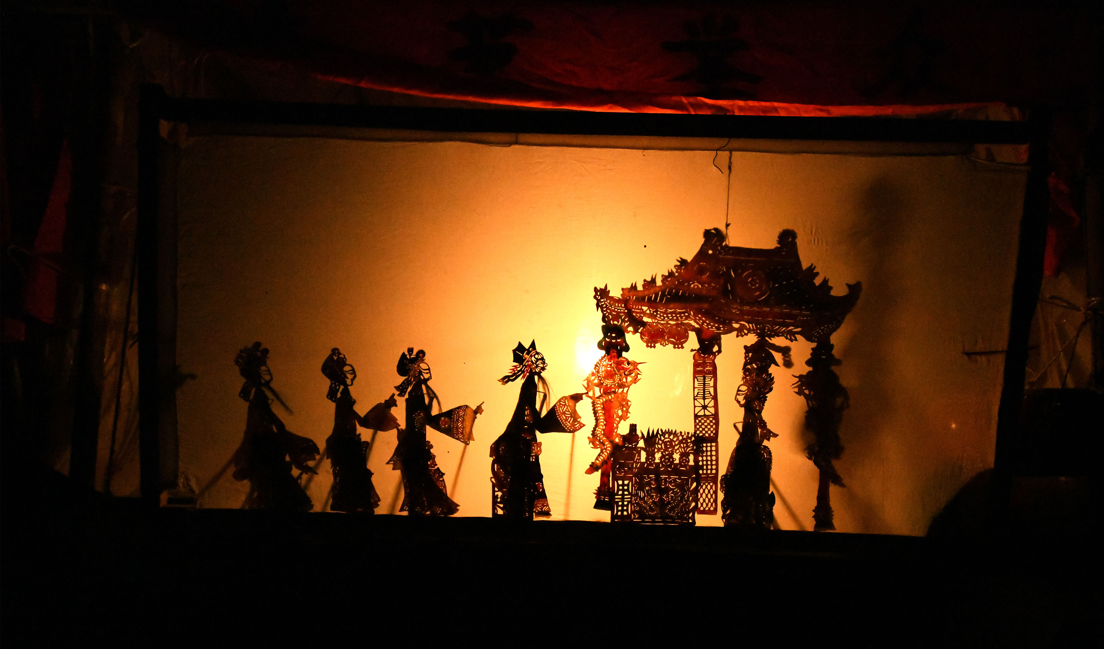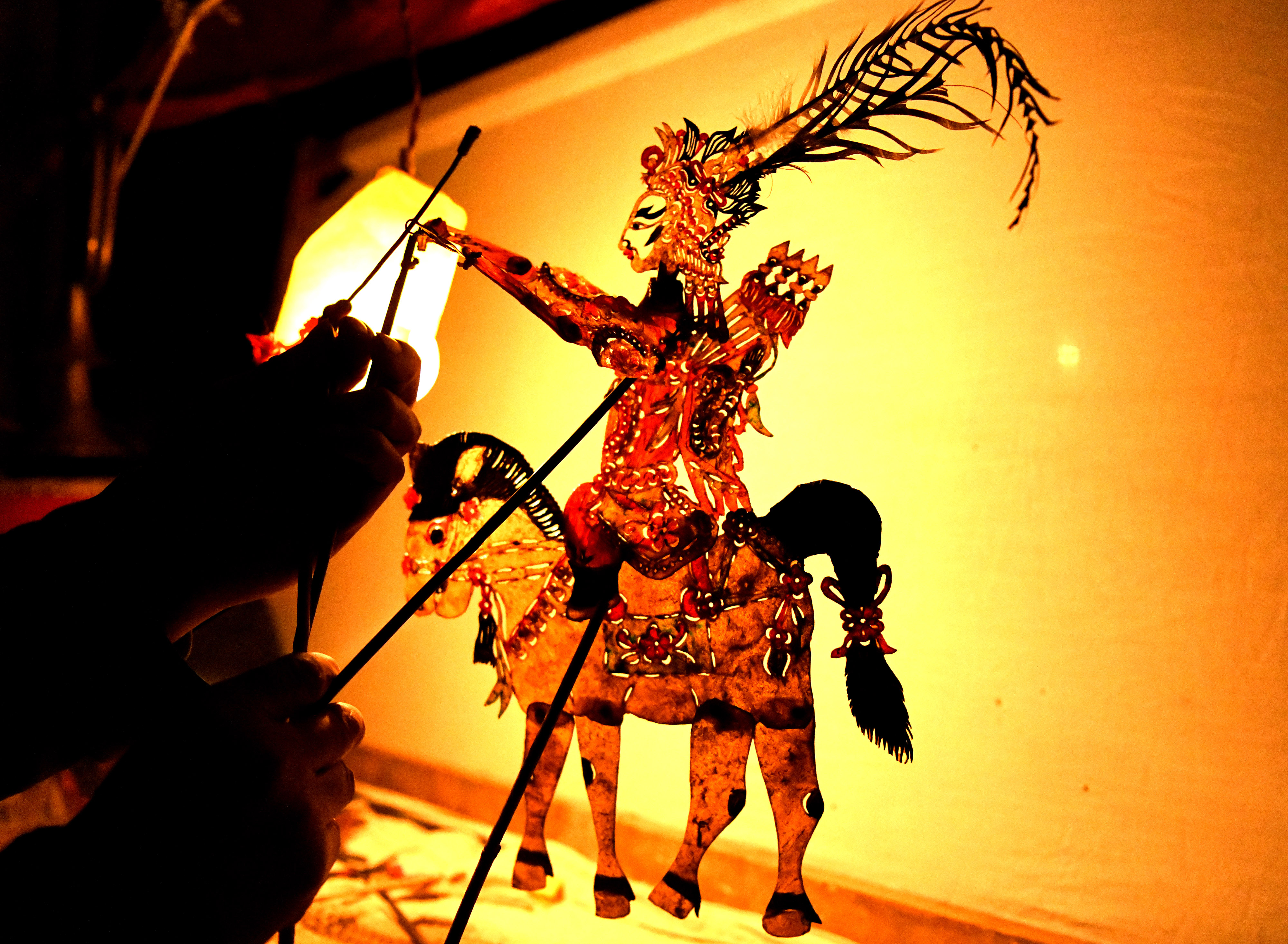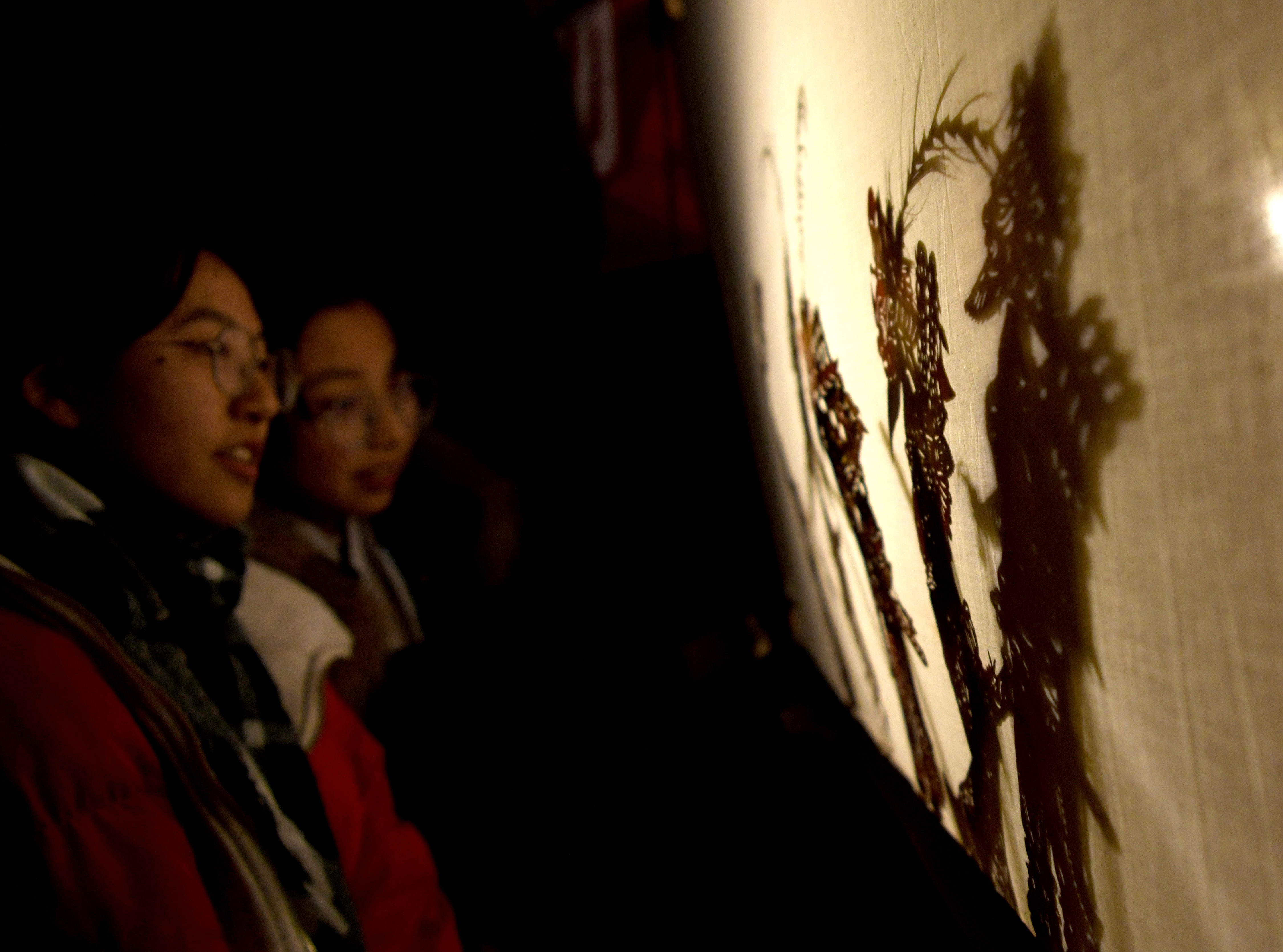 2月12日,在甘肅省定西市渭源縣清源鎮(zhèn)崔家河村,民間藝人在表演皮影戲。