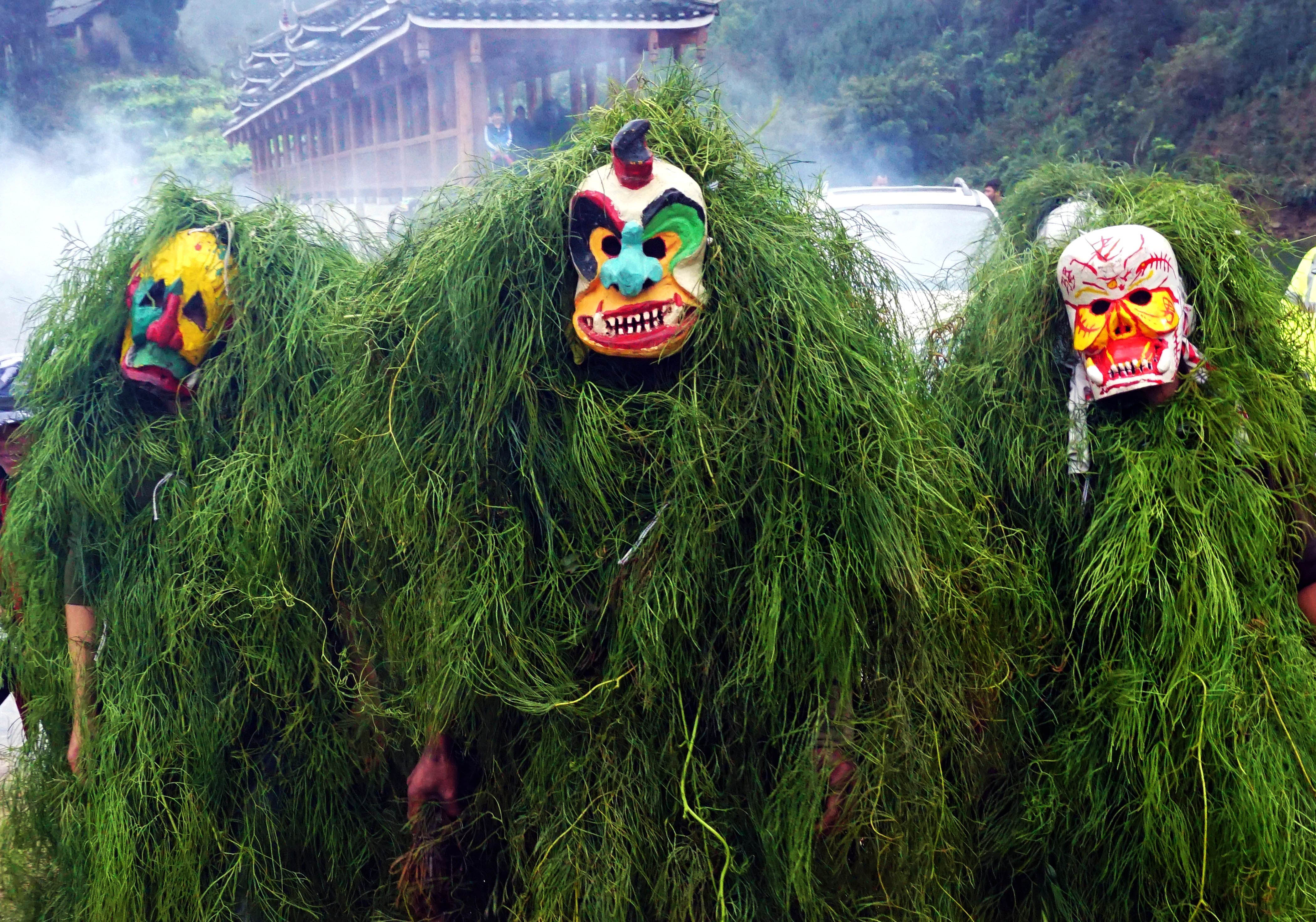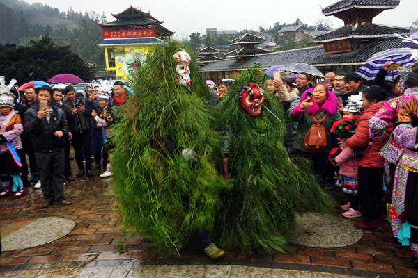 2月13日,在廣西柳州融安縣安寧村大袍屯,裝扮成“芒蒿”的苗族青年走村串戶送祝福。