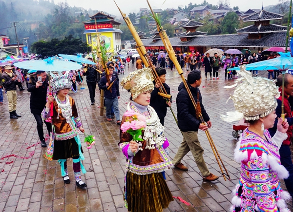 2月13日,在廣西柳州融安縣安寧村大袍屯,苗族群眾參加“芒蒿節(jié)”活動(dòng)。