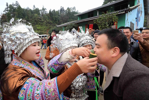2月13日,在廣西柳州融安縣安寧村大袍屯,一名游客在喝“攔路酒”。新華社發(fā)(譚凱興/攝)