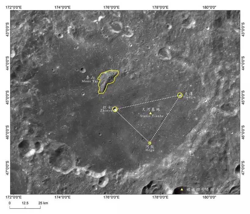 今天,中國國家航天局和國際天文學(xué)聯(lián)合會聯(lián)合發(fā)布嫦娥四號月球地理實體命名。經(jīng)國際天文學(xué)聯(lián)合會(IAU)批準(zhǔn),將嫦娥四號著陸點命名為“天河基地”,將著陸點周圍呈三角形排列的三個小環(huán)形坑分別命名為“織女”、“河鼓”和“天津”,將著陸點所在馮·卡門坑內(nèi)的中央峰命名為“泰山”。
