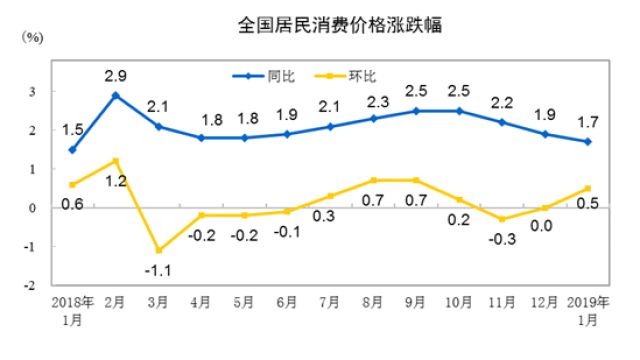 2019年1月份,全國(guó)居民消費(fèi)價(jià)格同比上漲1.7%。其中,城市上漲1.8%,農(nóng)村上漲1.7%;食品價(jià)格上漲1.9%,非食品價(jià)格上漲1.7%;消費(fèi)品價(jià)格上漲1.3%,服務(wù)價(jià)格上漲2.4%。
