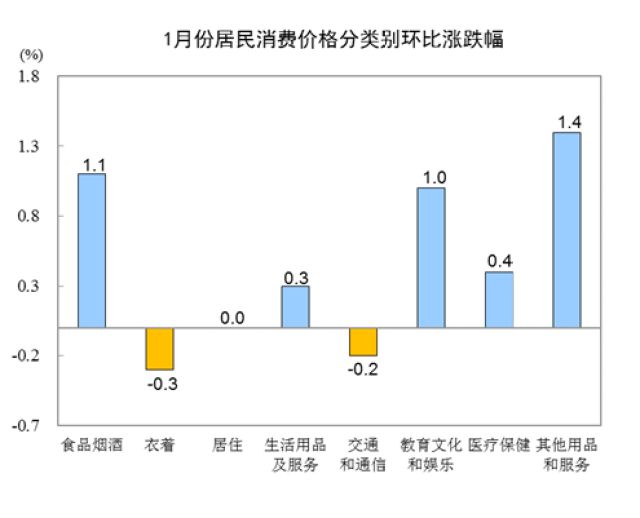 1月份,全國(guó)居民消費(fèi)價(jià)格環(huán)比上漲0.5%。其中,城市上漲0.5%,農(nóng)村上漲0.4%;食品價(jià)格上漲1.6%,非食品價(jià)格上漲0.2%;消費(fèi)品價(jià)格上漲0.4%,服務(wù)價(jià)格上漲0.6%。