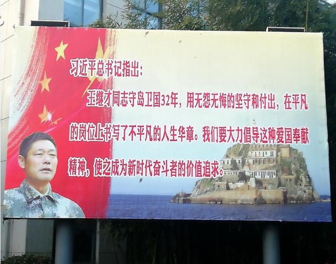 開(kāi)山島位于灌云縣的黃海前哨,王繼才夫婦自1986年7月15日起守護(hù)此島長(zhǎng)達(dá)32年,直至2018年7月27日王繼才突發(fā)疾病去世。灌云縣的大街小巷隨處可見(jiàn)王繼才守島的巨幅照片?!八窃酃嘣迫说尿湴?!”在這座百萬(wàn)人口的縣城里,連招待所門(mén)口的保安也能隨口講出幾段王繼才的故事。