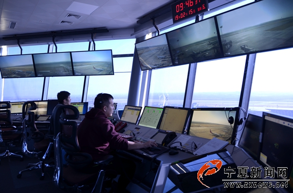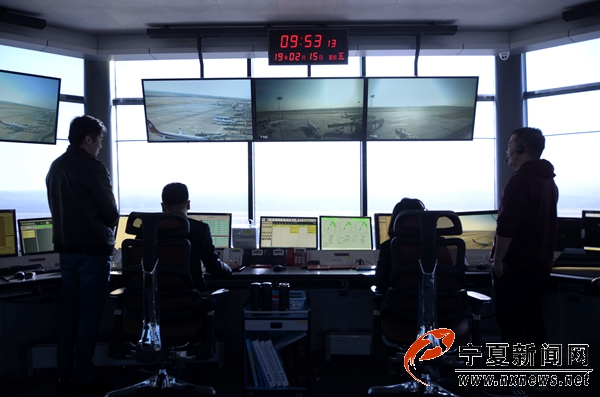 當(dāng)記者乘電梯來(lái)到距離地面70米的塔臺(tái)管制室,工作人員正在緊張地“指揮”進(jìn)出場(chǎng)航班。2名管制員坐在一排電腦前,時(shí)而目不轉(zhuǎn)睛地盯著電腦屏幕,時(shí)而拿起話筒喊話,并不停地在筆記本上記錄。電腦屏幕上,可以清楚地看到正在執(zhí)飛飛機(jī)的機(jī)型、高度、速度、特殊編號(hào)等信息。透過(guò)前方的玻璃窗,整個(gè)銀川河?xùn)|國(guó)際機(jī)場(chǎng)盡收眼底。