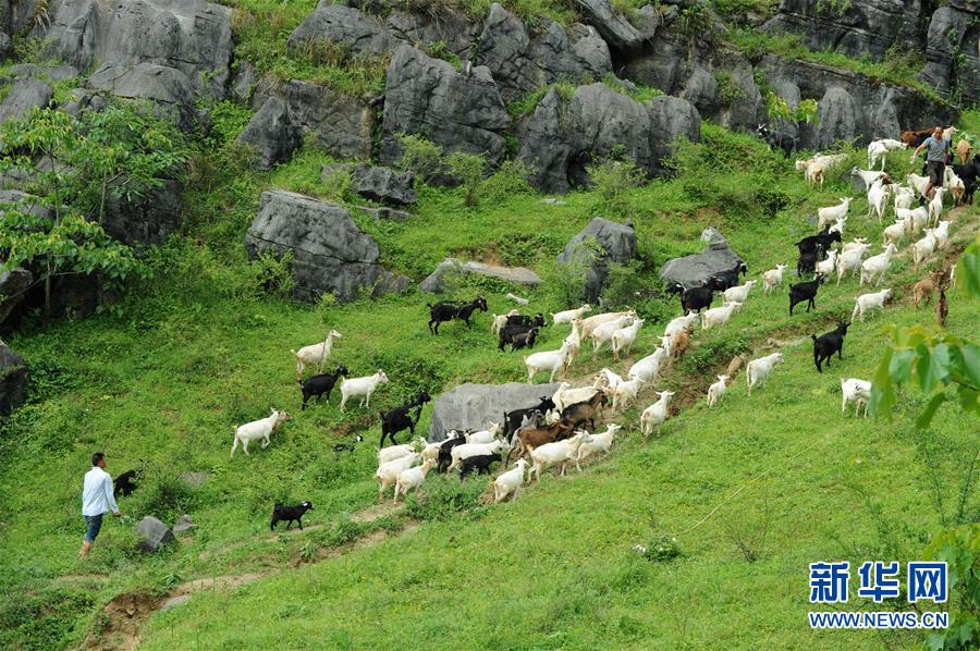 家住貴州省沿河縣中寨鎮(zhèn)三會(huì)溪村村民楊勝?gòu)?qiáng)(左)在山上放羊(2018年5月17日攝)。新華社記者楊文斌/攝