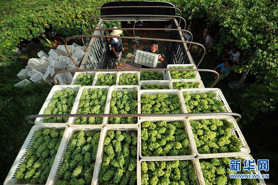 收購(gòu)商在貴州省玉屏縣新店生態(tài)葡萄現(xiàn)代農(nóng)業(yè)園區(qū)收購(gòu)水晶葡萄(2018年7月30日攝)。新華社記者楊文斌/攝