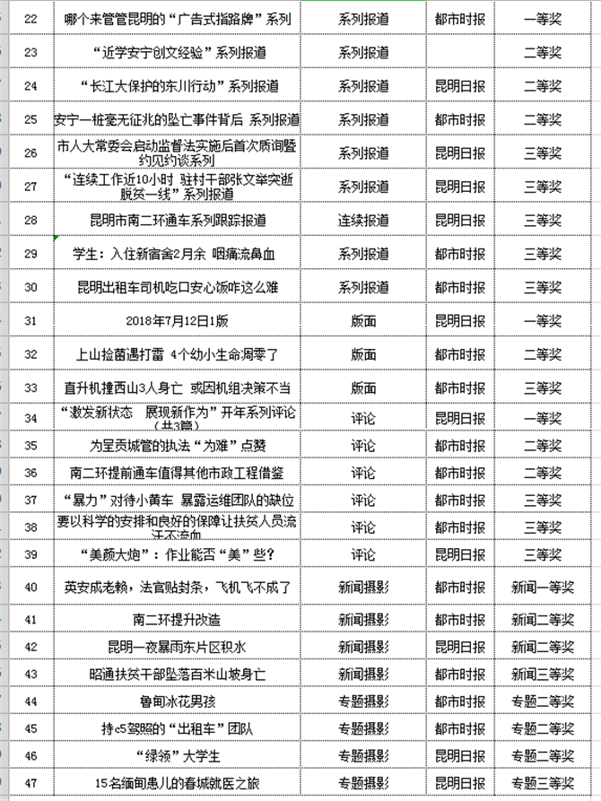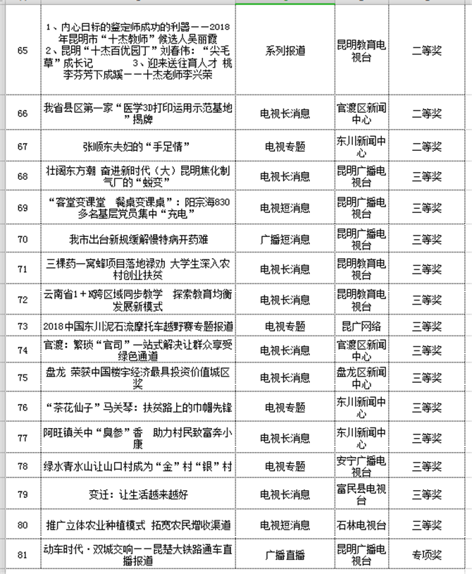 昆明信息港訊 記者江楓 經(jīng)過一個多月的評選,第二十一屆(2018年度)昆明新聞獎日前揭曉,共有112件作品獲獎。昆明信息港總計13件作品獲獎,其中,一等獎2件,二等獎6件,三等獎5件。