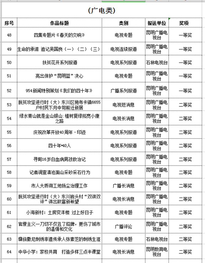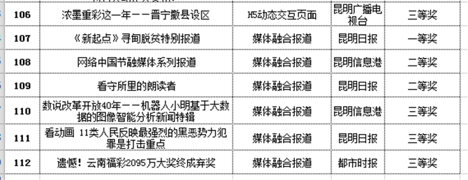 另外,昆港作品《論200元做一桌酒席的可行性》獲得網(wǎng)絡評論三等獎;《春城記》、《遇見最美昆明·鷗遇》獲得網(wǎng)絡專欄、視聽三等獎;《2018昆明市兩會新聞專題》獲得新聞專題、訪談三等獎;《數(shù)說改革開放40年——機器人小明基于大數(shù)據(jù)的圖像智能分析新聞特輯》獲得媒體融合報道三等獎。