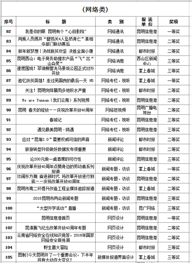 昆港作品《我是你的眼 昆明有個“心目影院”》榮獲網(wǎng)絡通訊一等獎;昆明信息港首頁榮獲網(wǎng)頁設計一等獎;《同乘人員揭開“碧雞關4人墜橋身亡”真相 多部門聯(lián)動善后》獲得網(wǎng)絡通訊二等獎;《壯闊東方潮 奮進新時代 將改革開放進行到底——慶祝改革開放40周年》獲得新聞專題、訪談二等獎;《昆滇騰飛慶祝改革開放40周年專題》、《云南省網(wǎng)絡安全在線知識競答,2018年國家網(wǎng)絡安全宣傳周》獲得網(wǎng)頁設計二等獎;《We are Yunnan(我們云南)》系列視頻獲得網(wǎng)絡專欄、視聽二等獎;《網(wǎng)絡中國節(jié)融媒體系列報道》獲得媒體融合報道二等獎。