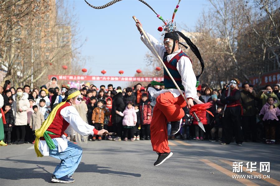 2月16日,在石家莊市深澤縣舉行的傳統(tǒng)民間花會(huì)進(jìn)城活動(dòng)中,民間藝人在表演“花臉社火”。 新華社發(fā) 張曉峰/攝