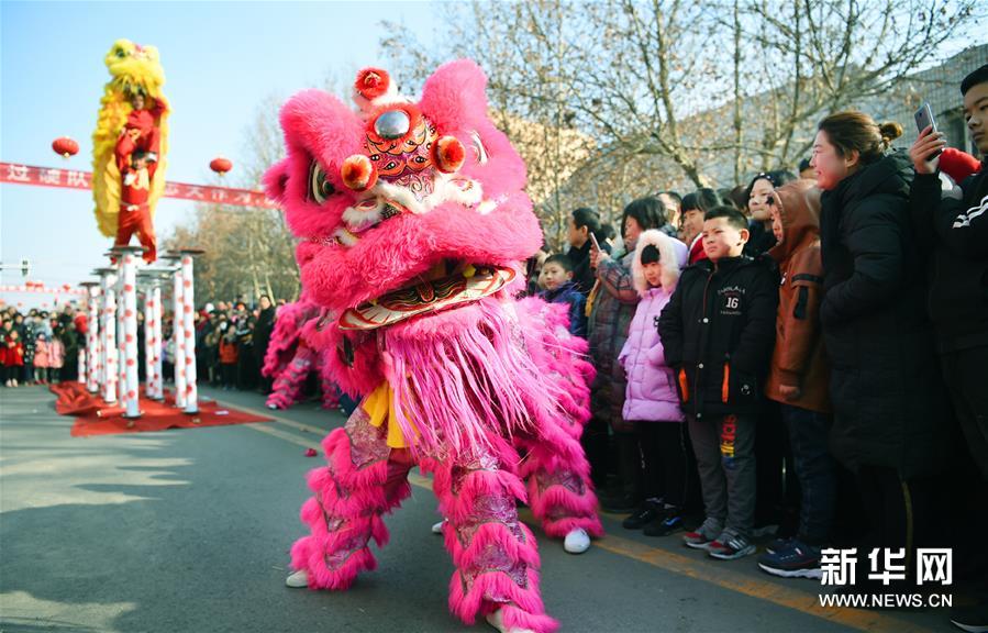 2月16日,在石家莊市深澤縣舉行的傳統(tǒng)民間花會(huì)進(jìn)城活動(dòng)中,民間藝人在表演舞獅。新華社發(fā) 張曉峰/攝