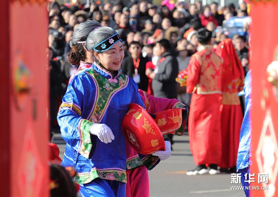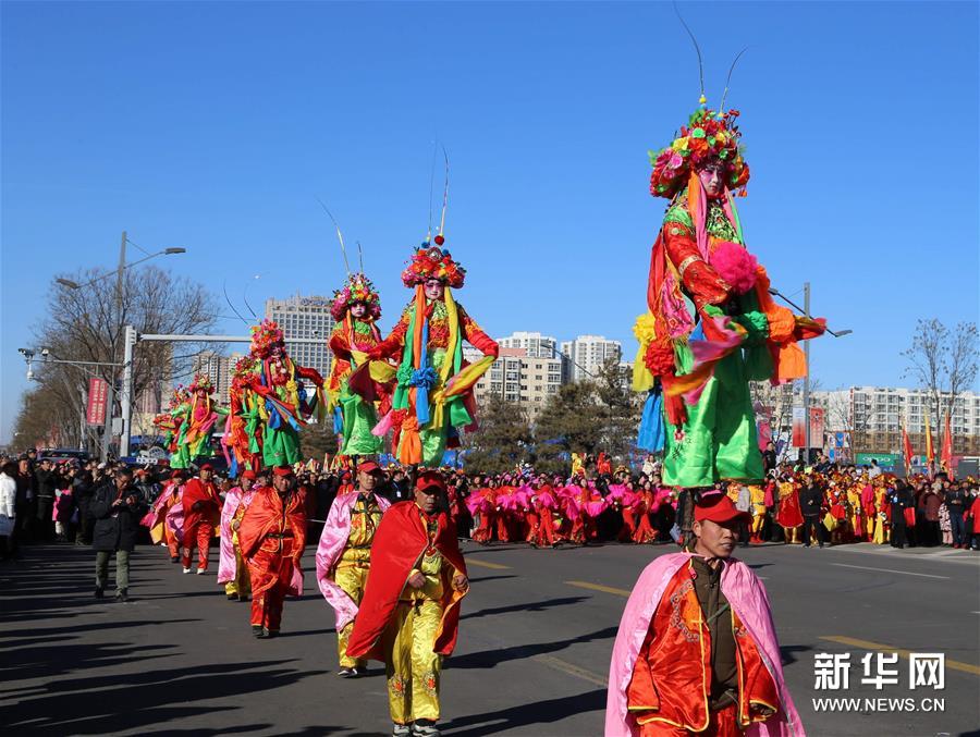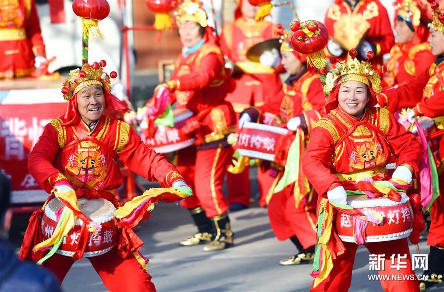 2月16日,在石家莊市深澤縣舉行的傳統(tǒng)民間花會(huì)進(jìn)城活動(dòng)中,民間藝人在表演趙州背燈挎鼓。 新華社發(fā) 張曉峰/攝
