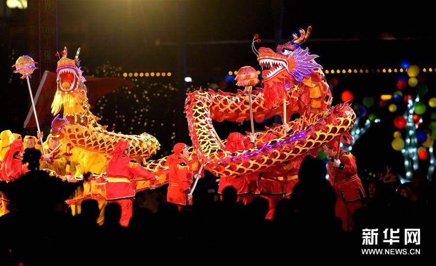 2月16日晚,人們?cè)诤笔⌒骺h城表演舞龍。新華社發(fā) 宋文/攝