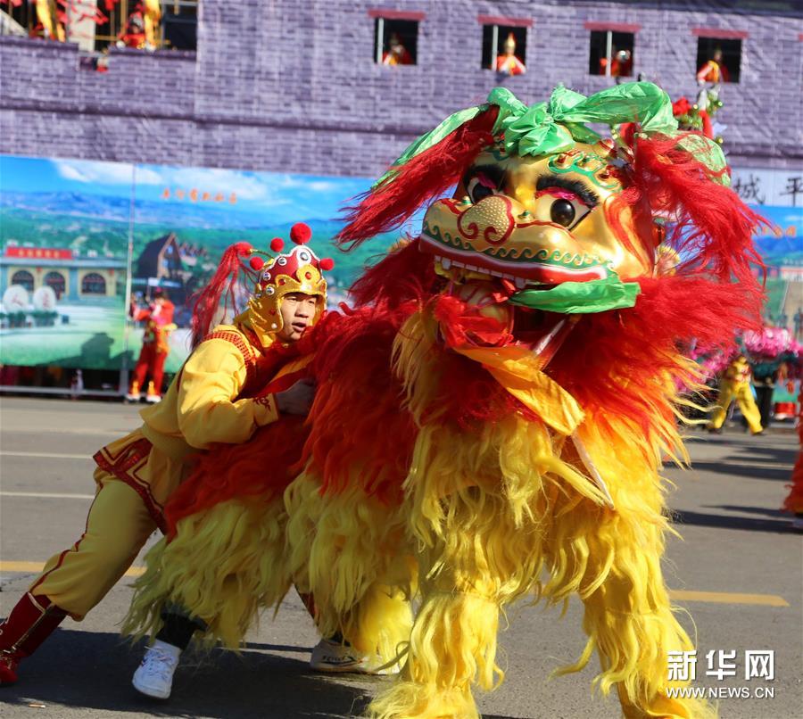 2月16日,山西省大同市舉行非物質(zhì)文化遺產(chǎn)展演,民間藝人在表演舞獅。新華社發(fā) 任雪峰/攝